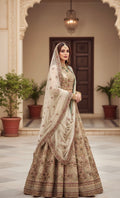 Upgrade your wardrobe with the Creamy pearl MR-240. This stunning lehnga choli and maxi set is made with delicate net fabric and adorned with crystal and pearl work. Complete the look with the intricately embroidered duppata. Elevate your style with this luxurious ensemble.
