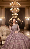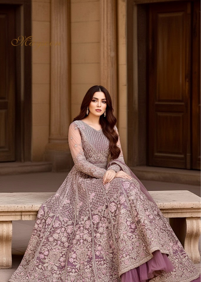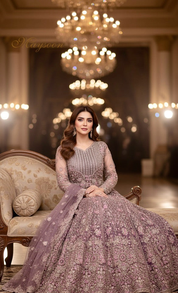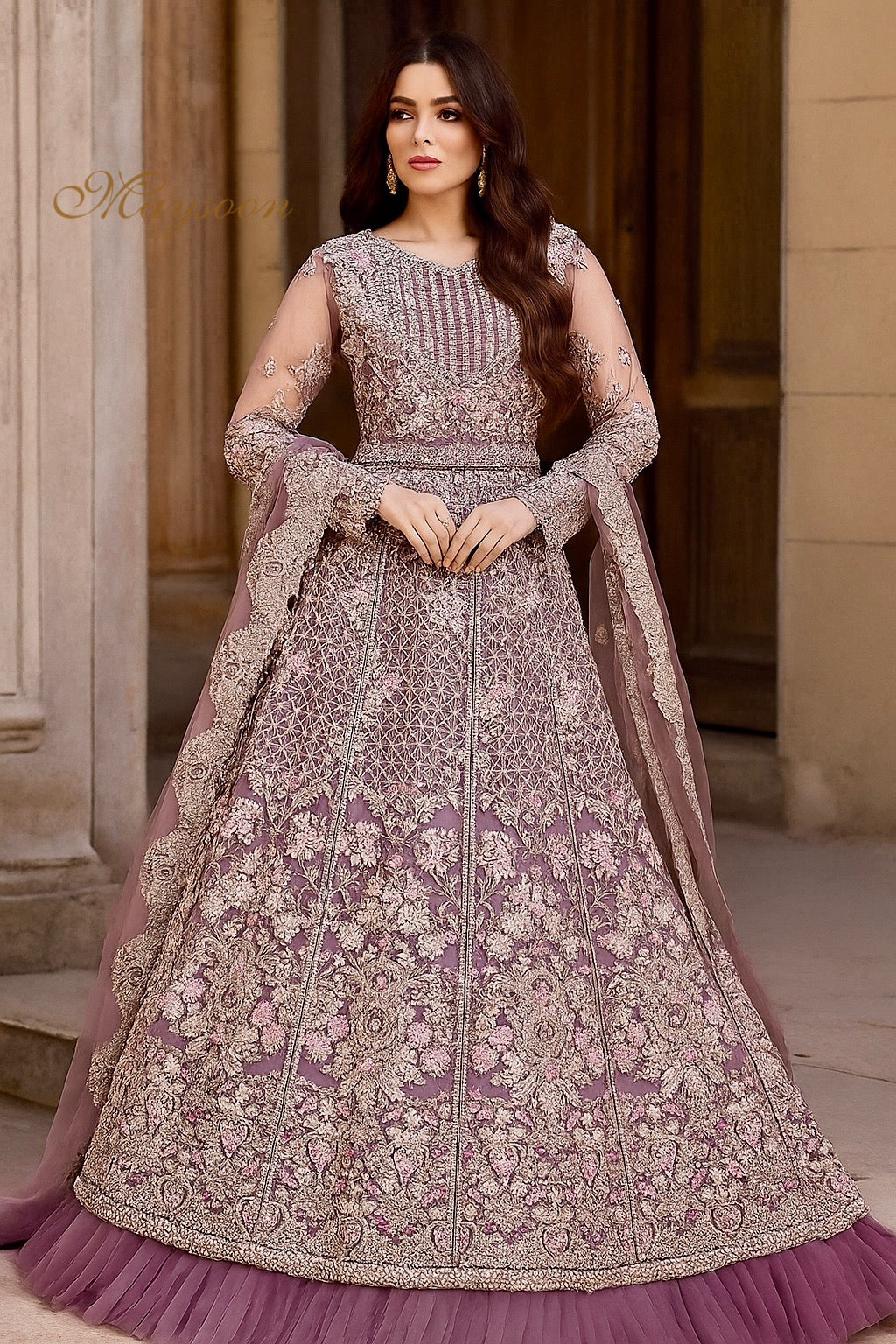 Experience luxury and elegance with the Levander MR-234 gown. Adorned with stunning lavender crystal and stone work on delicate net fabric, this dress is sure to make a statement. Its beautiful color and detailed design will leave you feeling confident and glamorous. Perfect for any special occasion.