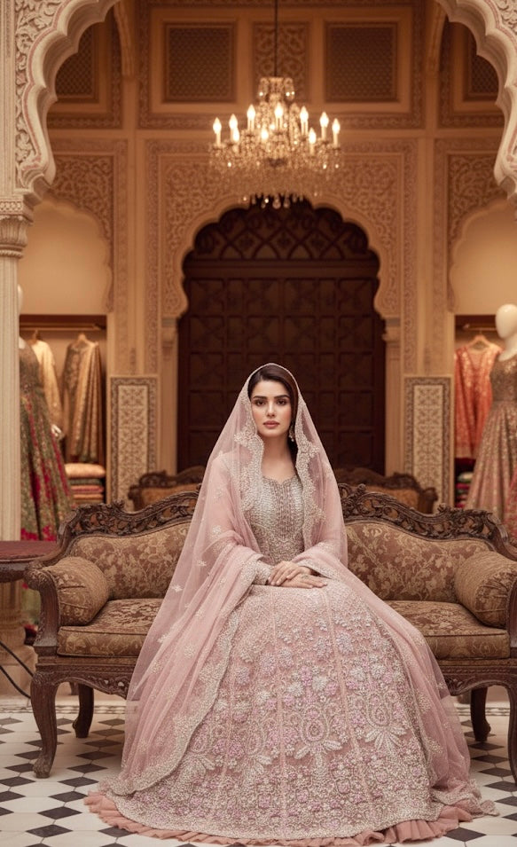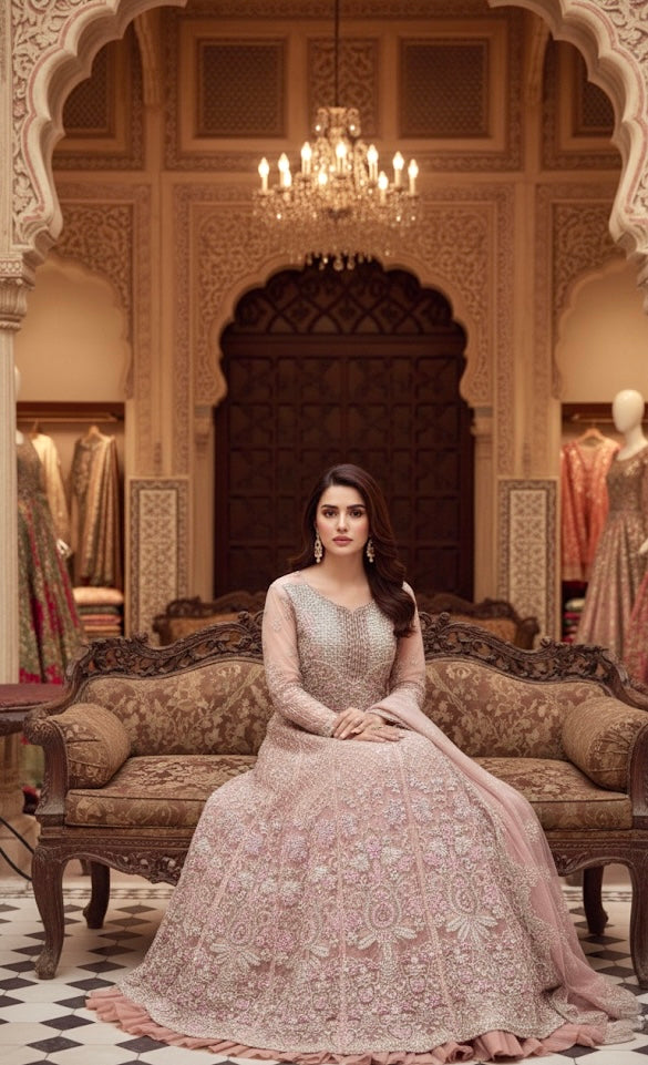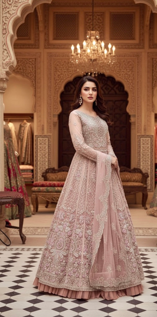 Featuring a stunning work of crystal and stones on a delicate net hand embroidered lehnga and maxi, the Mat pink MR-235 is a beautiful addition to any wardrobe. With intricate detailing and vibrant colors, this piece is perfect for special occasions and will make you stand out in a crowd. Elevate your style with this one-of-a-kind piece.