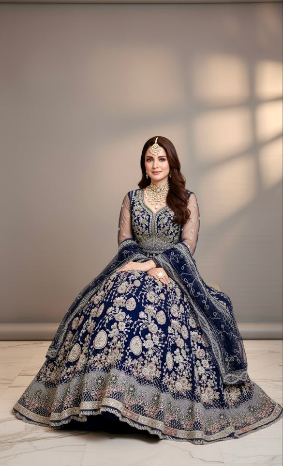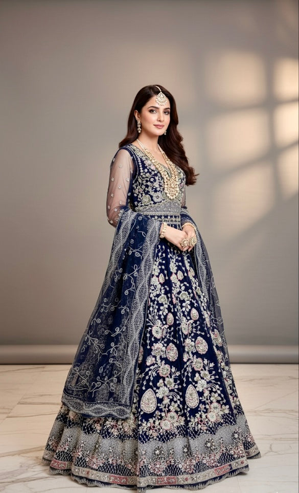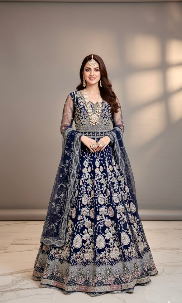 Expertly hand-crafted with a regal blue net lehenga choli and maxi, the Royal Diamond MR-275 exudes elegance and sophistication. The intricate hand-made work adds a touch of grandeur, perfect for any special occasion. Experience the beauty of royalty with this stunning ensemble.