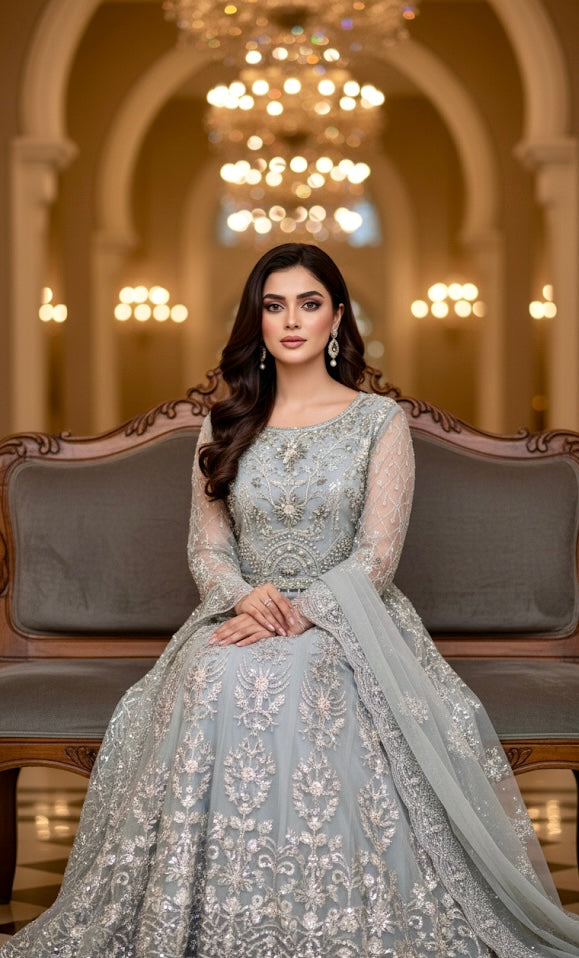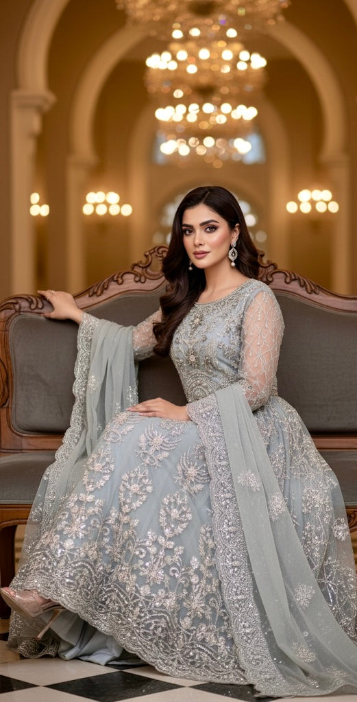 Expertly crafted to perfection, the Silver MR-249 is a stunning ensemble that combines beautiful crystal work with delicate silver detailing on its lehnga choli and maxi. Its elegant design showcases the perfect balance of traditional and modern elements, making it the perfect choice for any special occasion. Elevate your style with this timeless piece.